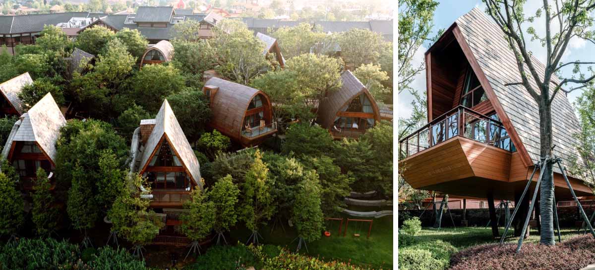 История отеля восходит к древней цивилизации. Это своего рода укрытие с широким обзором, позволяющее избежать опасности. Архитекторы подняли здания на высоту 5 метров, что открыло широкий обзор. В то же время высота домика на дереве такая же, как и крона дерева. Глядя в окно, можно увидеть пышные деревья, дающие людям возможность перемещаться по джунглям.